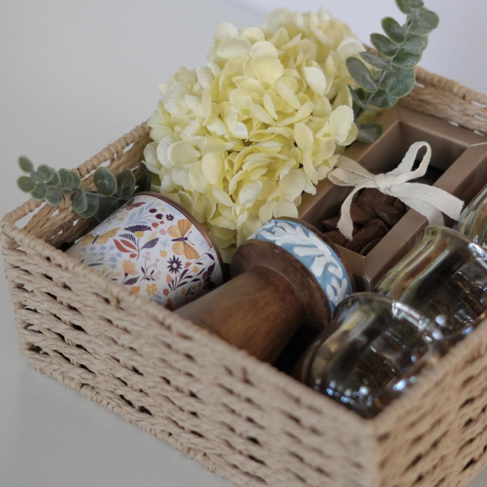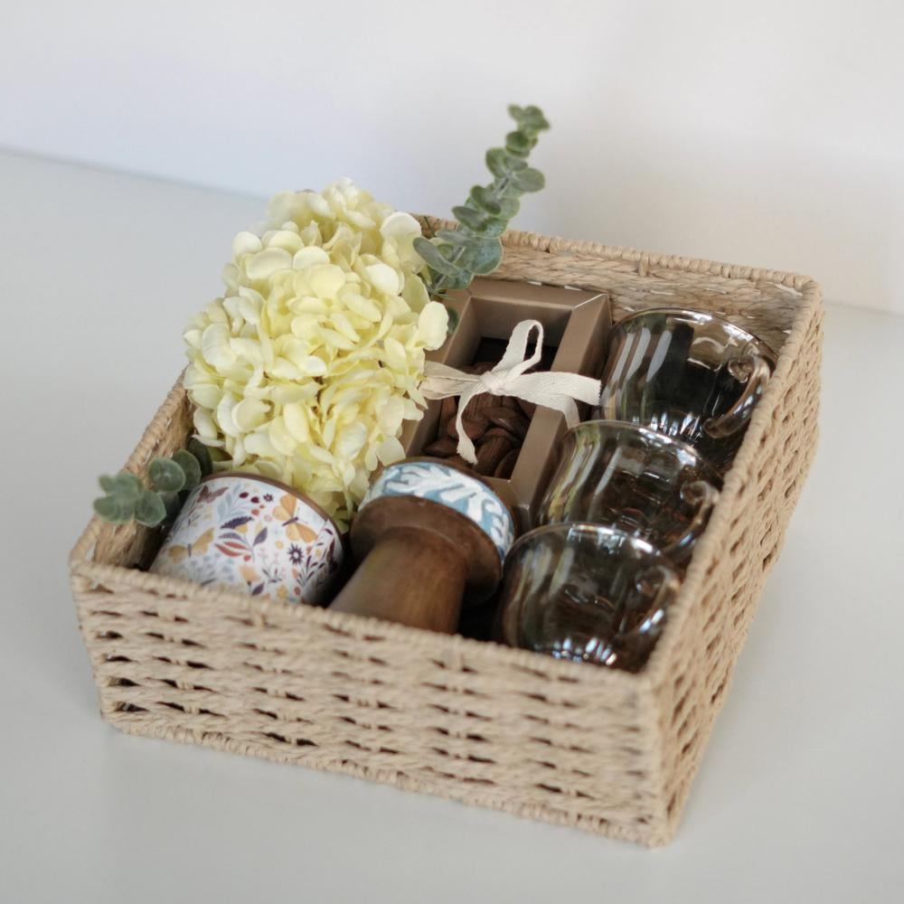تحتوي المجموعة على:سلة مربعةمبخرة خشبية أنيقةشمعة فواحة3 أكواب زجاجيةأوقية بخور موروكيمزينة بالورود الجذابة